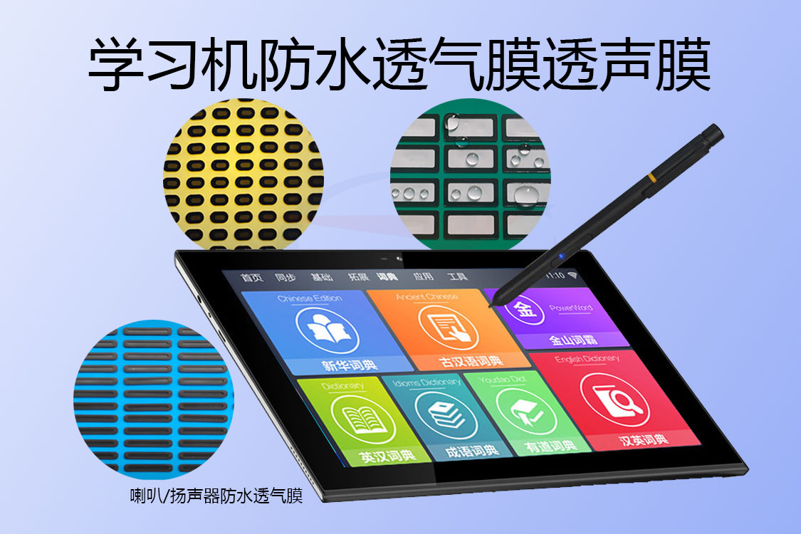 一般來說,學(xué)習(xí)機做防水基本上在兩個方面,一是外殼結(jié)構(gòu)的防水(比如說上下殼體與TP觸摸屏與殼體屏幕框體等),二是電聲器件或者說電聲器件對應(yīng)的殼體透聲孔部位的防水,更進(jìn)一步的是對于PCB電路板也做防水,對于外殼結(jié)構(gòu)防水一般是采用防水密封圈或者采用防水密封膠點膠加工工藝來實現(xiàn)防水,對于電聲器件的防水,一般是在電聲器件對應(yīng)的透氣孔透聲孔部位安裝學(xué)習(xí)機防水透氣膜透聲膜來實現(xiàn)防水透氣透聲的,如果對于電路板的防水則是通過納米防水材料涂覆實現(xiàn)的。薄弱的環(huán)節(jié)在于學(xué)習(xí)機防水透氣膜透聲膜上,在學(xué)習(xí)機防水透氣膜透聲膜滿足防水標(biāo)準(zhǔn)并實測通過后,也就是說薄弱的學(xué)習(xí)機防水透氣膜透聲膜環(huán)節(jié)通過了,就說明學(xué)習(xí)機整機也是符合相應(yīng)的防水要求的。